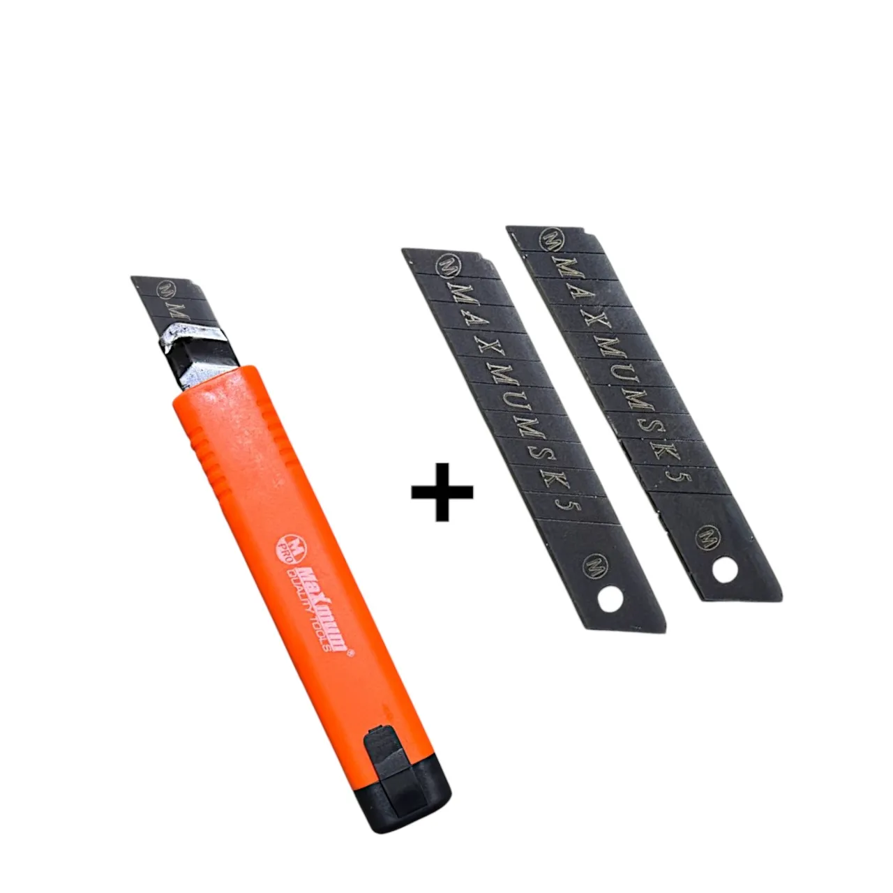 Стильный корпус из ABS пластика выпускается в 3 цветах и усилен металлической направляющей, а также отсеком для запаски и клипсой для подвеса. Общая длина ножа 160 мм, ширина 30 мм. Усиленный канцелярский нож поставляется с 2 чернеными лезвиями толщиной 0.6 мм, которые хранятся в специальном отсеке ножа.