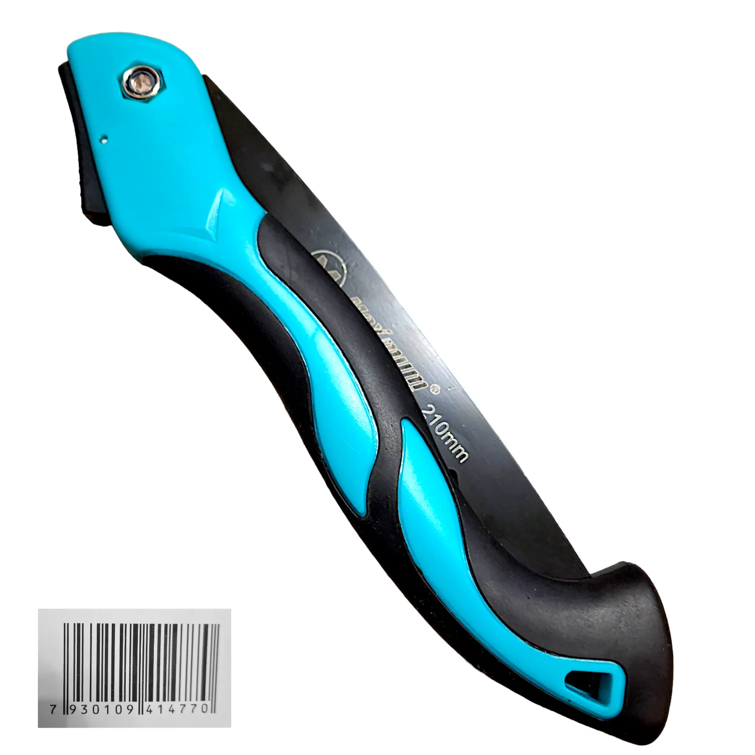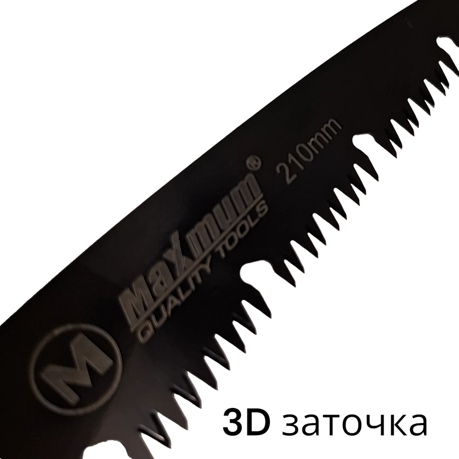 Удобная универсальная складная ножовка от "Maximum Quality Tools" имеет 3D заточку зубьев и специальную кнопку блокировки лезвия.
